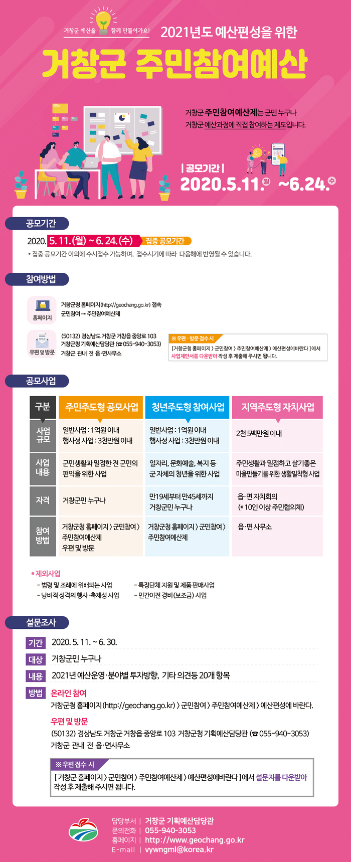 또한, 청년주도형 참여사업은 만 19세부터 45세까지 거창군민을 대상으로 일자리, 문화예술, 복지 등 관내 청년을 위한 사업을 발굴하는 것으로 거창군청 홈페이지를 통해 접수하고, 청년층의 의견을 적극 수렴할 수 있도록 온라인 선호도 조사도 병행하여 꼭 필요한 사업이 예산에 반영될 수 있도록 할 계획이다.