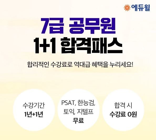 [시민일보 = 여영준 기자] 종합교육기업 에듀윌(대표 박명규)이 수강료 환급 혜택을 담은 7급공무원 시험 대비 ‘1+1 합격패스’ 과정을 선보인다.