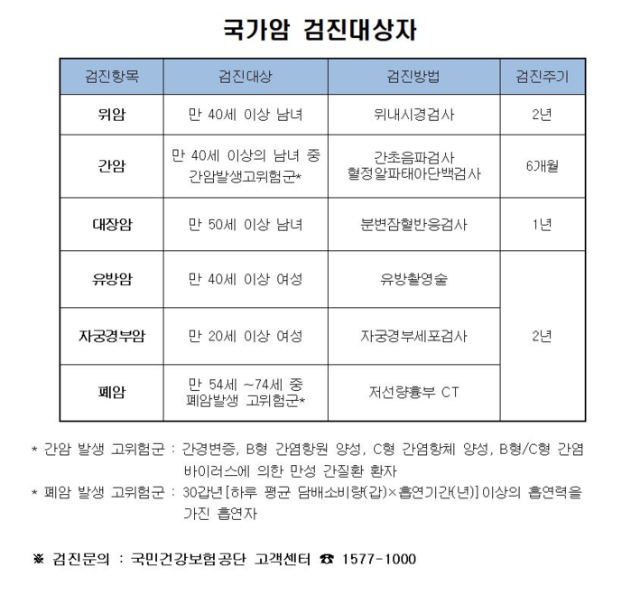 국가암 검진항목은 6대 암인 위암, 간암, 대장암, 유방암, 자궁경부암, 폐암이며, 올해 국가암검진은 홀수년도 출생자를 대상으로 연중 실시된다.