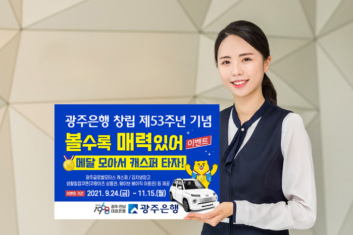 9월24일~53일간 진행되는 이번 이벤트는 ‘광주형일자리’ 모델로 탄생한 광주글로벌모터스(GGM) 신차 ‘캐스퍼’가 1등 당첨 경품으로 준비되어 많은 관심이 쏟아지고 있다.