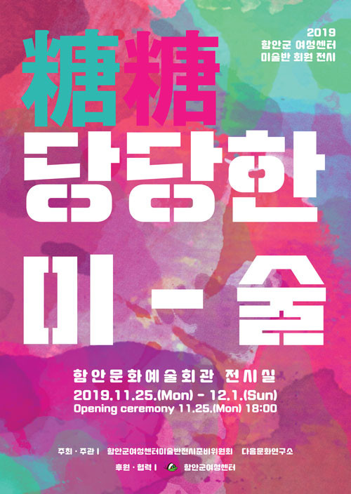 함안군은 11월 문화의 달을 맞아 함안군 여성센터 미술반이 주관하는 ‘2019 당당(糖糖)한 미술’ 전시회가 오는 25일부터 12월 1일까지 함안문화예술회관 2층 전시실에서 개최된다고 밝혔다.