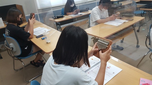 | ▲ 영암군, 관내 중학생 대상 여름방학 특강 프로그램 운영 / 엄지피아노 칼림바를 배우고 있는 학생들 / 사진=영암군 제공 |