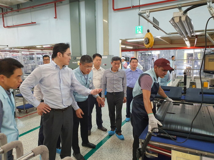 | ▲ 이재용 삼성전자 부회장이 브라질 현장 경영 이틀 째인 27일 오전(현지시간) 삼성전자 마나우스 공장 생산라인 내 스마트폰과 TV조립 공정을 살펴보고 있다.(사진제공=삼성전자) |