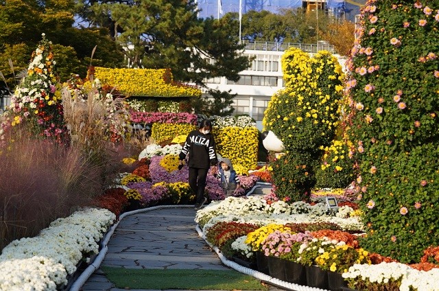 특히 나이아가라 폭포를 형상화한 국화 조형물에 LED 조명을 비춰 영상을 표현하는 미디어파사드를 활용, 야간에도 관람이 가능하도록 해 많은 인기를 끌고 있다.