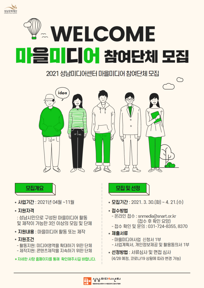 성남문화재단은 이번 마을미디어 사업을 통해 세대별, 계층별 다양한 미디어 동호회를 발굴하고, 내가 사는 마을을 거점으로 미디어를 통한 소통이 활발하게 이뤄짐과 동시에, 코로나19로 위축된 마을공동체와 지역사회에 활기를 불어넣는 계기가 되길 기대하고 있다.