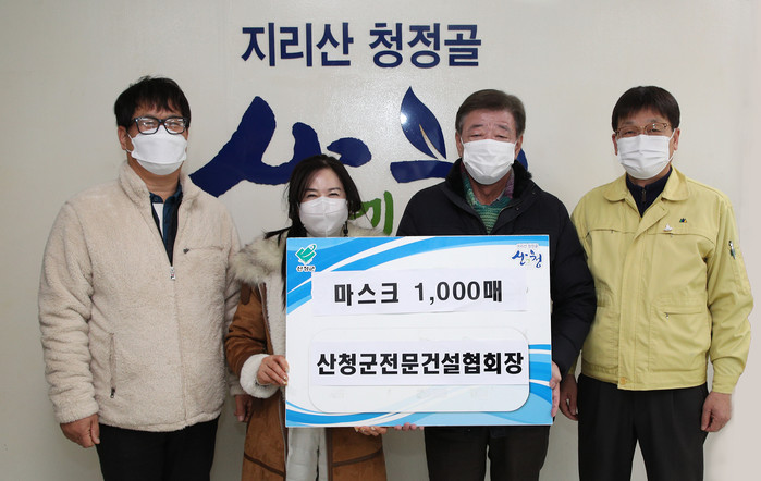 산청군은 11일 허가선 신임 산청군전문건설업협의회장이 군청을 찾아 KF94 마스크 1000매(100만원 상당)를 기탁했다고 밝혔다.