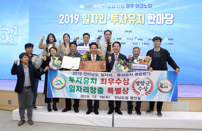 | ▲ '전남도 일자리·투자유치 종합평가'에서 투자유치 최우수상을 받은 영암군 전동평 군수 및 관계자들이 기념촬영을 하고 있다. |