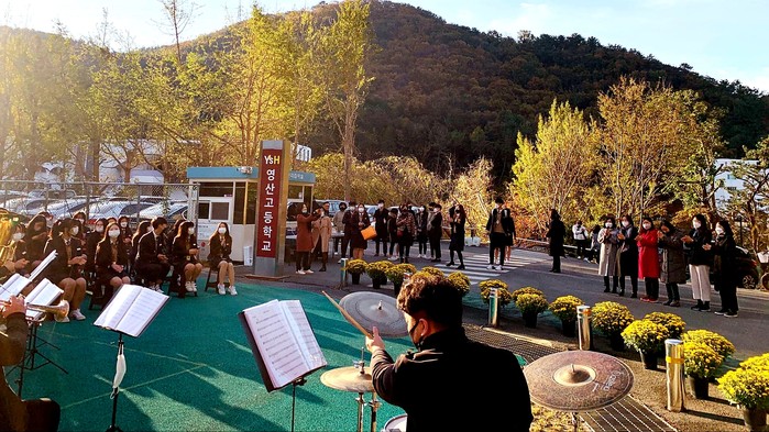 [부산=최성일 기자]부산 해운대구에 위치한 명품 특성화고 영산고등학교(교장 백용규)가 지난 5일 학생들 아침 등굣길에 작은 음악회를 실시하였다고 밝혔다. 가을을 느끼는 국화꽃 향기를 맡으면서, BBA관악협회 단원이 연주하는 금관 6중주를 들으면서 학생들은 신나게 등교를 하였다.