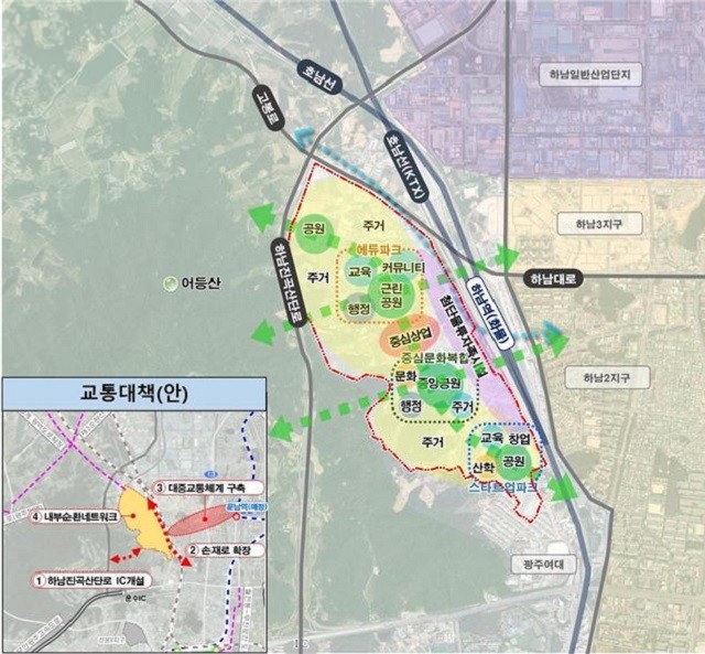 교통대책으로는 하남진곡산단로와 도심을 연결하는 도로 신설 및 연결IC 개량을 통해 무안광주ㆍ호남고속도로 등과의 광역 접근성을 향상시키고 도심방향 교통량이 집중되는 손재로 확장으로 도심과 접근성을 개선할 계획이다.