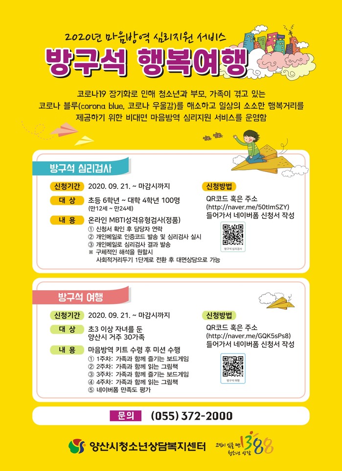 양산시 청소년상담복지센터는 코로나 블루에 지쳐있는 청소년과 부모의 심리건강을 증진시키고 일상으로의 복귀를 돕고자 마음방역 심리지원서비스‘방구석 행복여행’을 운영한다.
