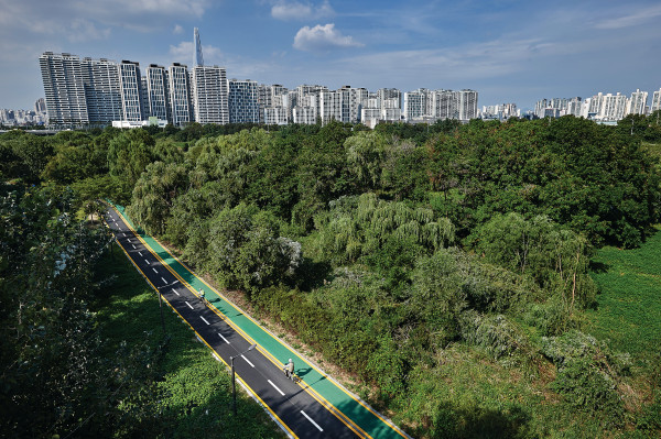 | ▲ 주변 숲과 어울리는 깔끔한 색상과 패턴으로 정비된 탄천 인근 도로. (사진제공=송파구청) |