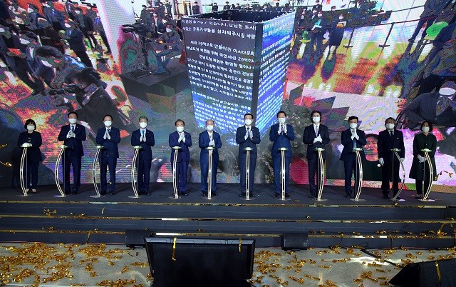 | ▲ 이용섭 광주광역시장이 21일 오전 시청 시민홀에서 열린 제56회 광주시민의 날 기념식에 참석해 참석내빈 및 시민들과 함께 '전환의 탑'을 향해 버튼을 작동하는 퍼포먼스를 한 후 기념촬영을 하고 있다./광주광역시 제공 |