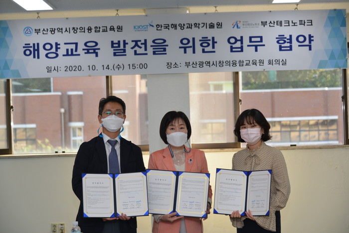 부산광역시창의융합교육원(원장 이연행)은 지난 14일 오후 3시 창의융합교육원 3층 회의실에서 해양분야 인재를 육성하고 해양교육 발전과 대중화를 위해 해양과학기술원(원장 김웅서), 부산테크노파크(원장 최종열)와업무협약을 체결했다고 지난 15일 밝혔다.