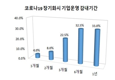 조사 결과에 따르면 코로나로 인한 현재 위기상황이 지속한다면 3개월 이상 버티기 어렵다고 응답한 기업이 34.5%로 만일 코로나 영향이 향후 6개월 이상 지속하면 전체의 3분의 2에 달하는 67.0%가 한계기업으로 내몰릴 수 있다고 응답했다.