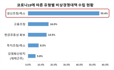 비상경영 대책으로는 생산 축소가 55.4%로 가장 많았고 이어서 고용 조정 16.0%, 현금 유동성 확보 14.5%, 투자축소 8.3%, 감염확산 방지 노력 5.8% 순이었다.