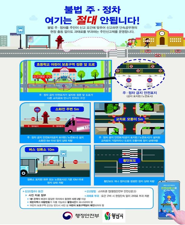 양산시는 오는 6월 29일 전국적으로 시행하는 어린이보호구역 내 불법 주·정차 주민신고제를 운영한다.