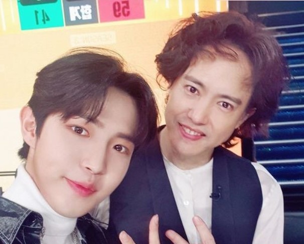 공개된 사진 속 양준일은 후배가수 김재환과 함께 다정한 모습이다.