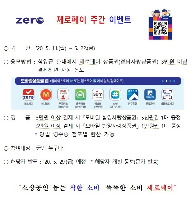 함양군 관내에서 제로페이 상품권(경남사랑상품권)을 3만원이상 결제하면 자동 응모되며 오는 29일 상품권 지급 대상자에게는 별도로 문자 발송할 계획이다.