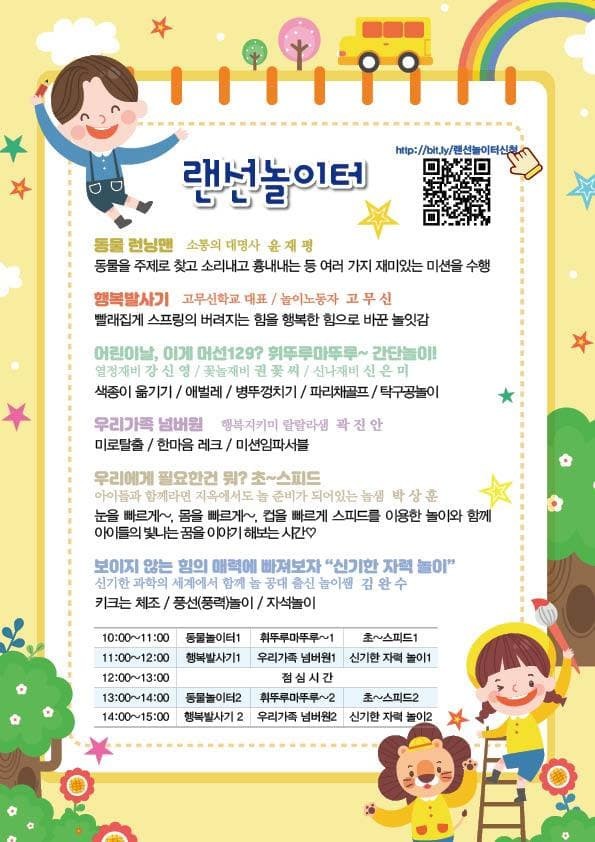 어린이날인 5월 5일에는 줌을 활용한 ‘랜선 놀이터’가 오전 10시부터 1시간 간격으로 5회에 걸쳐 방영되며, 이날 UCC, 사행시 공모전의 수상자를 발표하고 시상품 및 경품도 제공한다.
