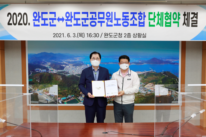 이번 협약은 지난해 10월 완도군공무원노동조합으로부터 단체 교섭 요구서가 접수되어 두 차례의 예비 교섭과 다섯 차례의 실무 교섭을 통해 노사가 상생 협력하는 노사 문화를 만들어가자는데 뜻을 같이하고자 이루어졌다.