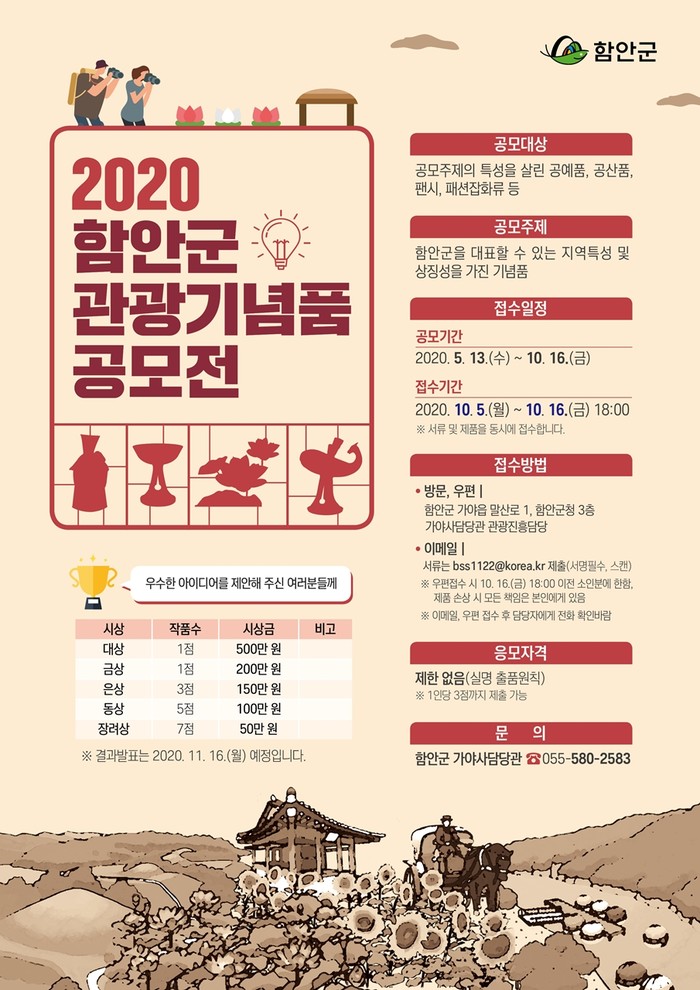 함안군은 창의적이고 우수한 관광기념품을 발굴하고 여행하기 좋은 함안을 알리기 위한 관광마케팅 활용을 위해 2020년도 함안군 관광기념품 공모전을 개최하고 오는 16일까지 제품을 접수받는다.