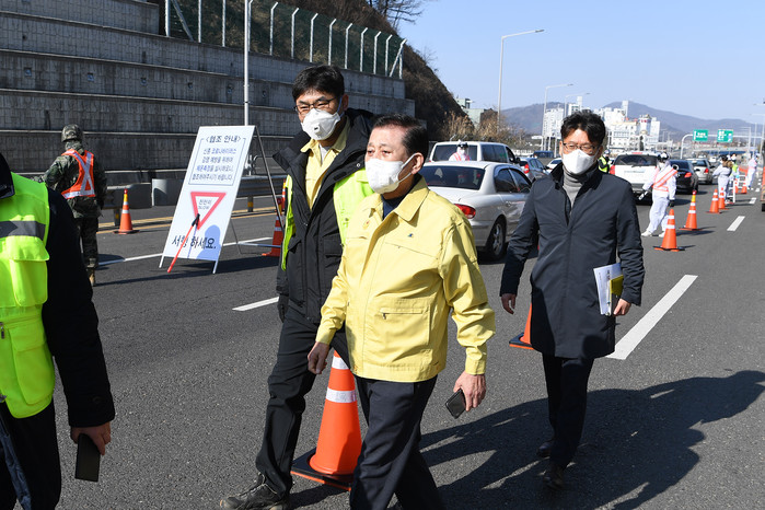 | ▲ 강화대교와 초지대교에서 발열검사 요원과 이야기를 나누고 있는 유 군수(가운데). |