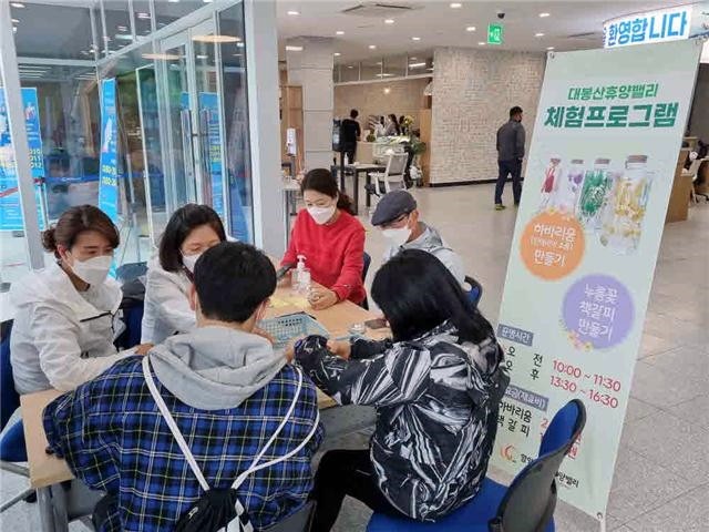 이에 대봉산휴양밸리는 방문객들에게 특별한 경험을 선물하기 위해 휴양밸리관 1층 로비에 인테리어소품을 만들어 볼 수 있는 체험프로그램을 운영하고 있으며, 지난 주말 창원에서 온 한 고객은 지인 선물용으로 한꺼번에 10개를 만들어 가는 등 방문객들에게 큰 호응을 얻었다.