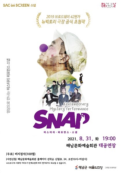 ‘스냅’은 세계시장을 목표로 제작한 무언극 공연으로 직관적인 무대언어와 동화적인 스토리텔링을 바탕으로 마임, 그림자아트, 미디어아트, 신체극 등을 마술과 결합한 몽환적이면서도 유쾌한 작품으로 온 가족이 함께 즐길 수 있는 공연이다.