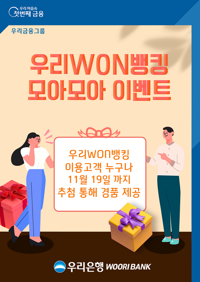 [시민일보 = 홍덕표 기자] 우리금융지주 자회사 우리은행은 우리WON뱅킹 이용 고객에게 감사의 마음을 담아 풍성한 경품을 제공하는 '모아모아 이벤트'를 오는 11월19일까지 진행한다고 7일 밝혔다.