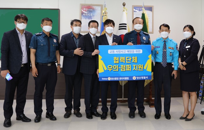 이번 지원은 양산중앙로타리클럽(회장 박상우)회원들과 협력단체가 13일 양산경찰서를 방문해 우의·점퍼 지원 전달식을 가졌다.
