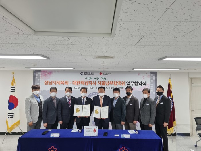 [성남=오왕석 기자] 성남시체육회와 대한적십자사 서울남부혈액원은 성남시체육회 대강당에서 지난 19일 '생명나눔단체 협약식 및 헌혈행사'를 진행했다.