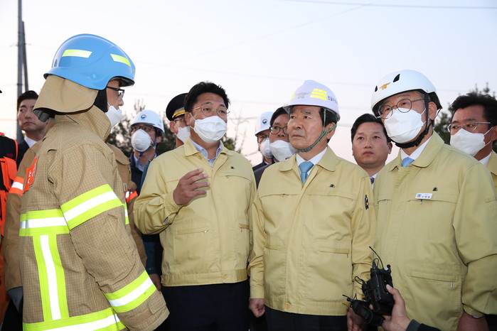 | ▲ 엄태준 시장(왼쪽 두 번째)이 정세균 국무총리, 이재명 경기도지사 등에게 화재현장 상황을 설명하고 있다.(사진제공=이천시청) |