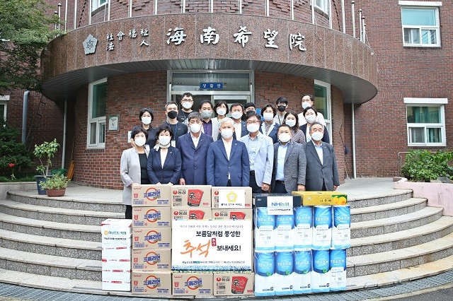 | ▲ 김병덕 해남군의회 의장 및 의원 일동, 14일 추석맞이 사회복지시설 희망원 방문 위문품 전달 기념촬영 / 사진=해남군의회 제공 |
