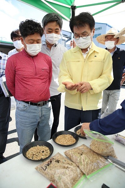 | ▲ 이승옥 강진군수가 18일 쌀귀리 수매현장을 방문해 쌀귀리 품질을 확인하기 위해 채취한 샘플의 상태를 확인하고 있다. / 사진=강진군 제공 |