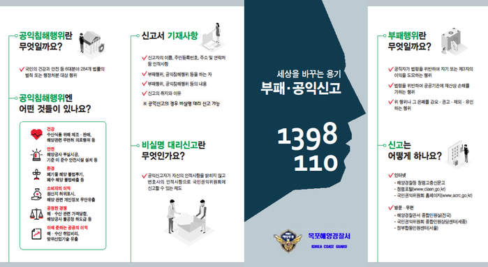▲ ‘세상을 바꾸는 용기 부패·공익신고 1398 또는 110’ 리플릿 (사진제공=목포해양경찰서) |