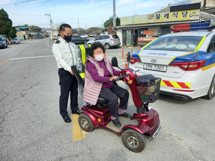 농어촌 지역 특성상 주‧야 경운기 등 농기계 운행이 잦고 특히, 추수 막바지에 이른 현시점에서 야간에 시인성 부족으로 사고 발생시 치사율 등 교통사고 발생 위험이 고조되어 언택트 교통치안활동으로 농기계 교통사고예방 야광반사지 및 어르신 전동차 야광X반도 부착활동을 중점 추진하고 있다.