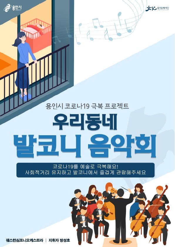 [용인=오왕석 기자] (재)용인문화재단(이사장 백군기)은 코로나19 위기 경보 '심각' 단계 지속과 세계보건기구의 팬데믹 선언 등 ‘사회적 거리두기’ 실천으로 문화예술을 접하기 힘든 용인 시민을 위해 ‘찾아가는 음악회’인 <우리동네 발코니 음악회Ⅱ>를 개최한다.