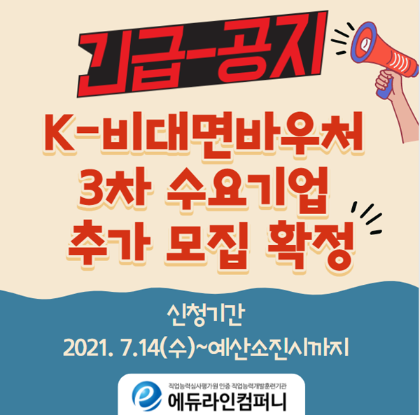 [시민일보 = 이승준] K비대면 바우처 에듀테크 분야 공급기업인 에듀라인컴퍼니(곽경아 이사)는 K-비대면 바우처 에듀테크 3차 수요기업을 추가모집 중이라고 1일 밝혔다.