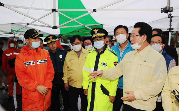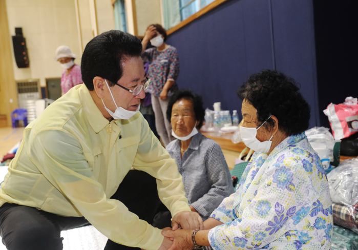 ▲ 김영록 도지사가 수해현장 찾아 수해민들을 위로하고 하고 있다.(출처=전라남도청) |