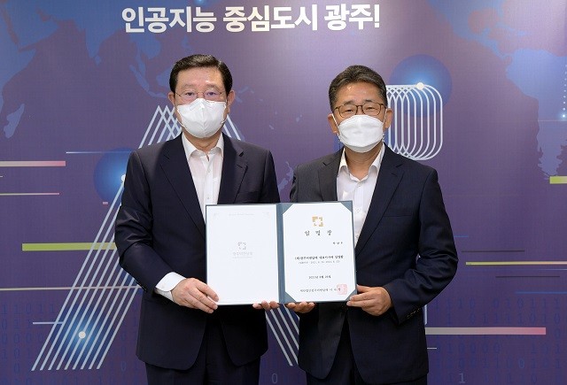 [광주=정찬남 기자] 이용섭 광주비엔날레재단 이사장이 26일 오전 시청 접견실에서 박양우 광주비엔날레 신임 대표이사에게 임명장을 수여한 후 기념촬영을 하고 있다.