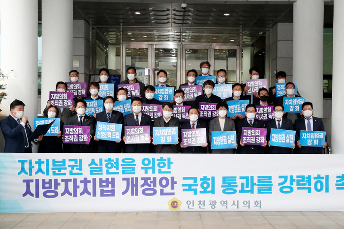 인천시의회는 최근 남궁형 자치분권특별위원장이 발의한 '자치분권 실현을 위한 지방자치법 전부개정안 국회 통과 촉구 결의안'을 본회의에서 채택한데 이어 결의대회를 의회 본관 앞에서 개최했다. 사진은 지방분권 실현 등 구호를 제창하는 의원들의 모습.(사진제공=인천시의회)