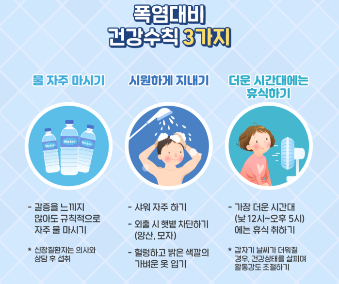 온열질환 예방을 위해서는 폭염이 발생했을 때는 갈증이 나지 않더라고 규칙적으로 물을 섭취하고, 가장 더운 시간인 낮 12시 ~ 오후 5시에는 활동을 줄이며 불가피 하게 외출 시에는 양산, 모자 등으로 햇볕을 차단하거나 헐렁한 옷을 착용해야 한다.