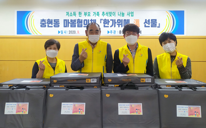 [시민일보 = 홍덕표 기자] 서울 서대문구(구청장 문석진) 충현동 마봄협의체가 최근 추석 명절을 앞두고 지역내 저소득 한부모가정 30가구를 위한 ‘한가위에 溫 선물’ 행사를 진행해 주위를 훈훈하게 했다.