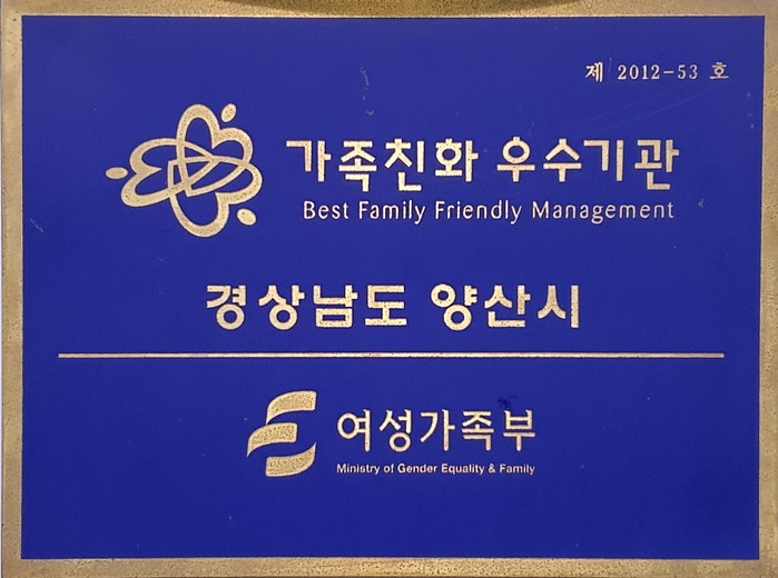 2012년 가족친화기관으로 최초 인증 받은 양산시는 2015년 유효기간연장, 2017년 재인증을 받았으며, 올해 다시 가족친화제도 모범 운영 공공기관 지위를 획득하게 되어 2023년 11월까지 가족친화기관 자격이 유지된다.