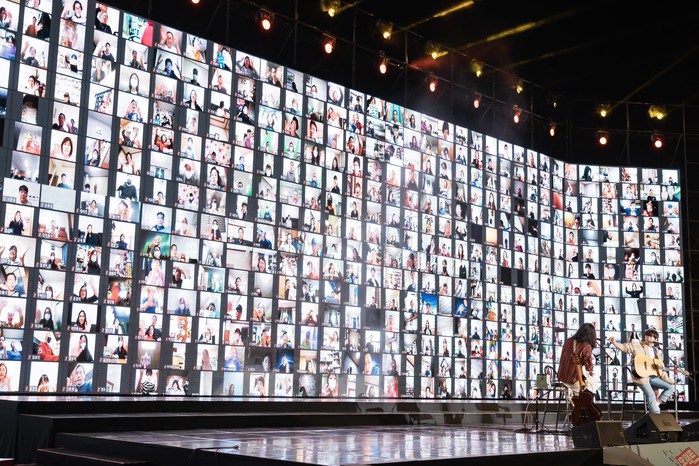 | ▲ 제25회 강동선사문화축제의 마지막 날 ‘이음식’에서 온라인으로 동시 접속한 주민 600명이 무대 위 대형 LED 화면에 나타나 윤도현의 초대공연을 함께 즐기는 모습. |
