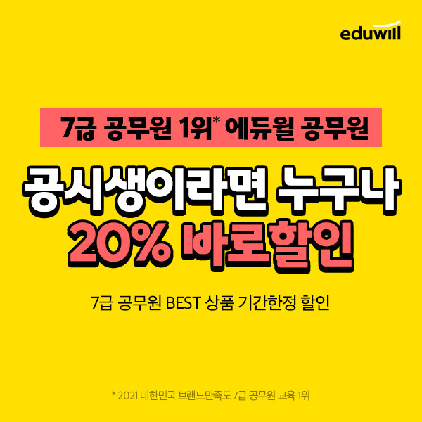 [시민일보 = 여영준 기자] 종합교육기업 에듀윌(대표 박명규) 공무원이 자사 7급공무원 BEST강의 수강료를 즉시 할인 해주는 이벤트를 진행 중이라고 밝혔다.