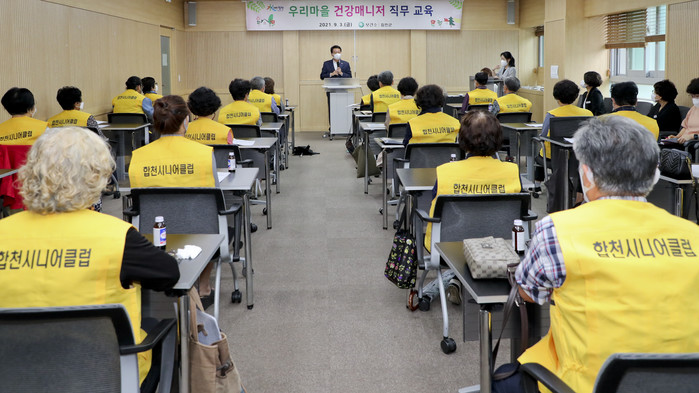 [합천=이영수 기자] 합천군(군수 문준희)은 지난 3일 합천 시니어클럽 노인일자리사업 참여자 대상으로 실시한 직무교육을 시작으로 코로나19 감염병 대응 및 사회적 거리두기 등으로 발생한 보건사업 공백을 최소화하기 위해 ‘우리 마을 건강매니저’ 사업을 시작한다고 밝혔다.
