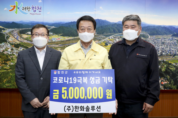 합천군(군수 문준희)은 ㈜한화솔루션(대표이사 김희철)이 지난 7일 합천군청을 방문해 코로나 19로 어려움을 겪고 있는 군민들을 위해 써 달라며 500만원을 기탁했다고 밝혔다.