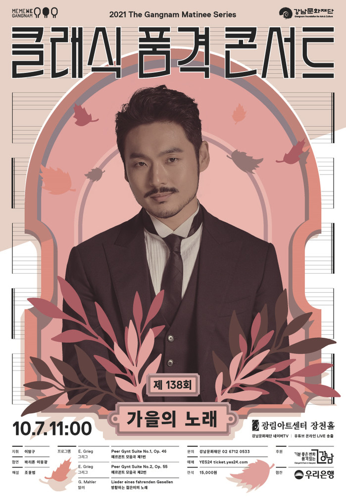 10월 ‘클래식 품격 콘서트’는 강남심포니오케스트라 이탐구 부지휘자의 지휘로 ‘그리그’의 ‘페르귄트 모음곡 1,2번’과 ‘말러’의 ‘방황하는 젊은이의 노래’가 연주된다.