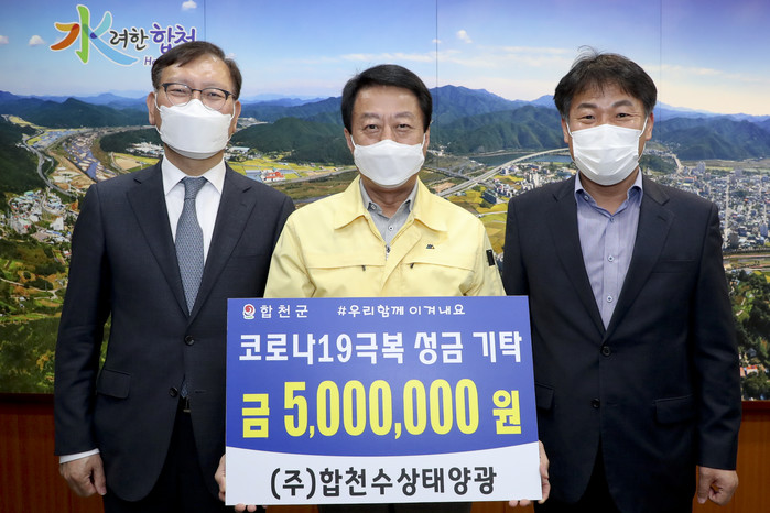 합천군(군수 문준희)은 ㈜합천수상태양광(대표이사 윤보훈)이 지난 7일 합천군청을 방문해 코로나 19로 어려움을 겪고 있는 군민들을 위해 써 달라며 500만원을 기탁했다고 밝혔다.